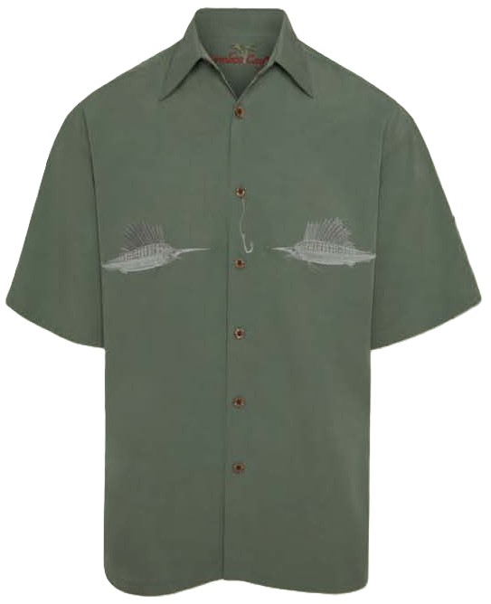 Flying Triple Rods is a spectacular new camp shirt to add to your collection and be the best dressed in any room without drawing any attention! 3 Fishing Rods at the backside with one sailfish caught at the collar while another sailfish is caught at the front. Embossed Modal blend fabric to continue the feel of upscale resort wear and copyrighted artwork to express your humor in a subtle yet tasteful way. Exclusive Men’s Bamboo Cay Button-Up Shirt offers the needs of an exotic relaxed state in mind, but equally comfortable and luxurious anywhere. This short sleeve camp shirt has all the bells and whistles including authentic coconut buttons and point collar. The wearer’s backside features 3 tonal fishing rods searching for a delicious sailfish to catch. At the front, there is a curved panel acting as the body of water where the sailfish has jumped out and got caught. Soon to be released after a kiss, the colored sailfish add a tasteful concept to this design. All Bamboo Cay shirts include come comfortable side vents for relaxing and two back pleats to add comfort.