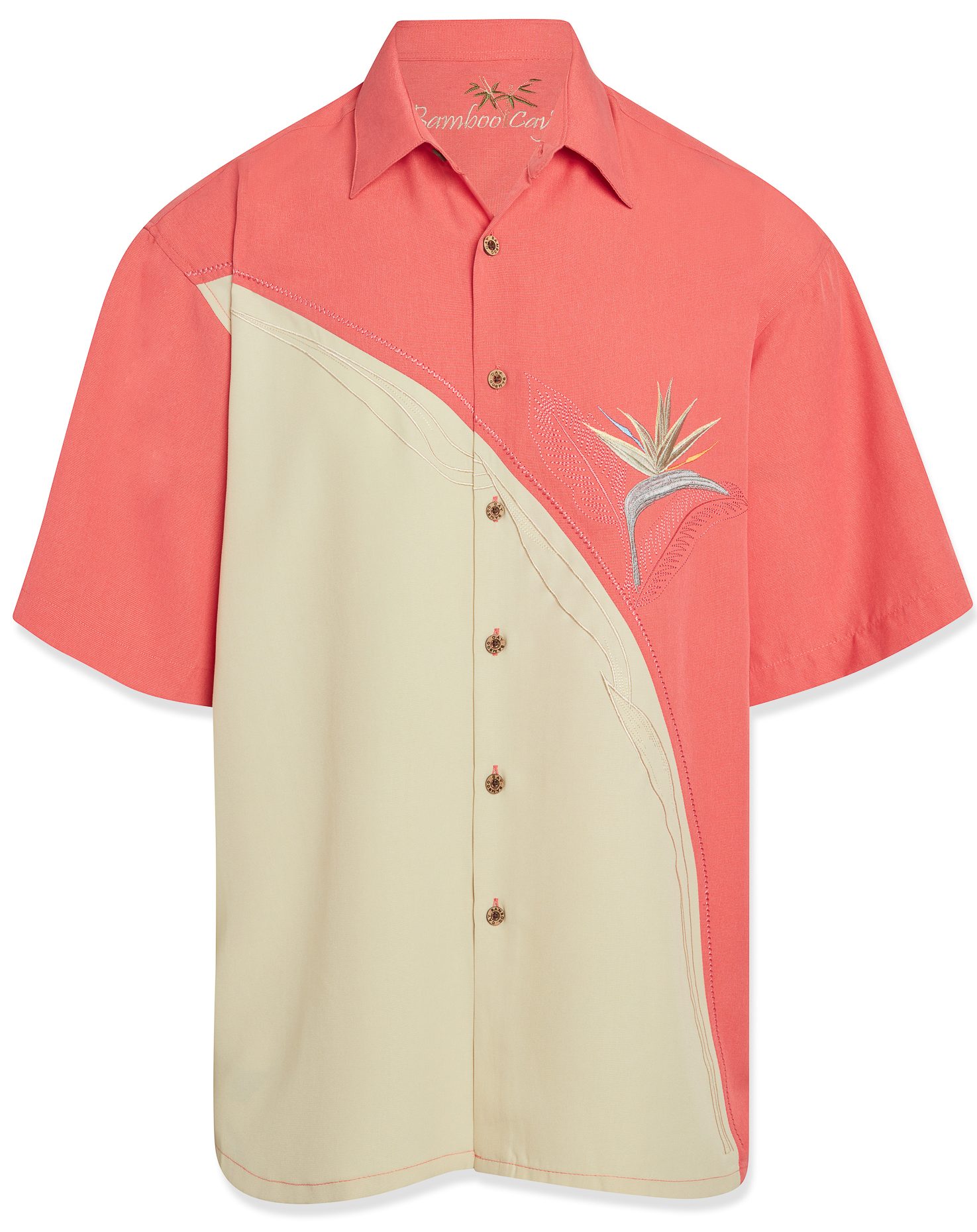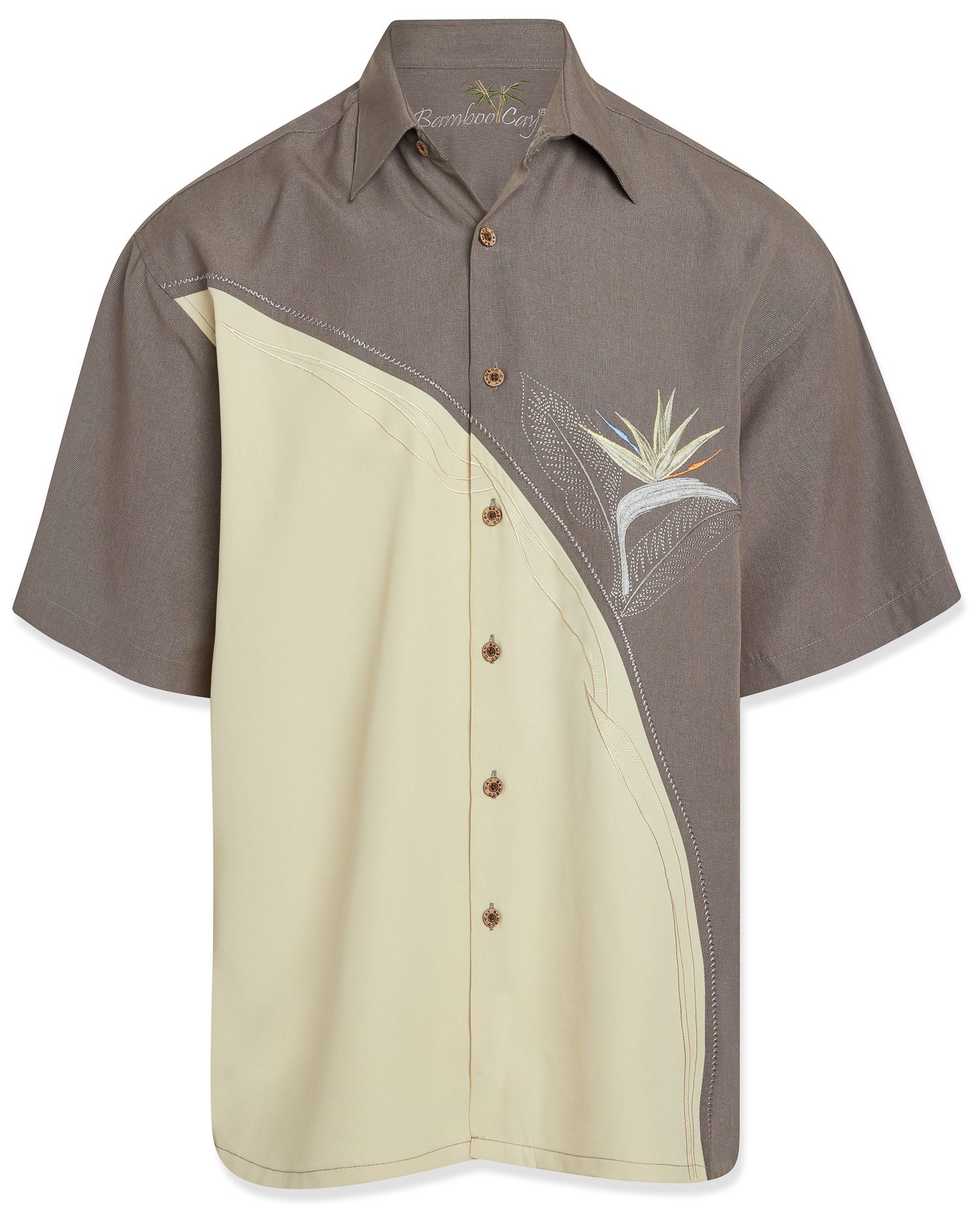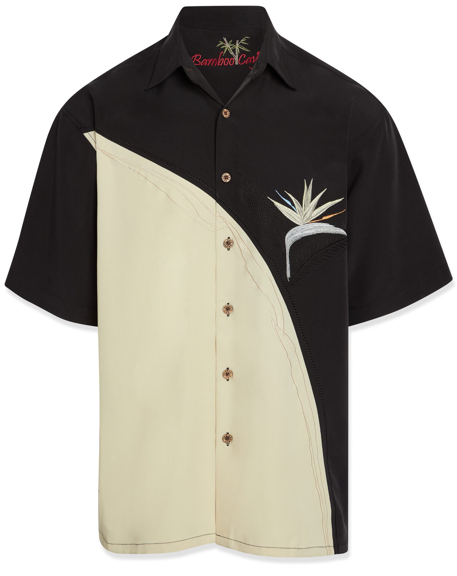 Adding an element of design, this diagonal panel features a brightly colored embroidered Bird of Paradise made up of 66,000 stitches. Add some striking tropical style to your look with this comfortable camp shirt featuring 66,000 stitches bird of paradise embroidery that is accented with a curved panel and decorative stitching. Bamboo Cay signature classic and a tasteful collector’s item.
