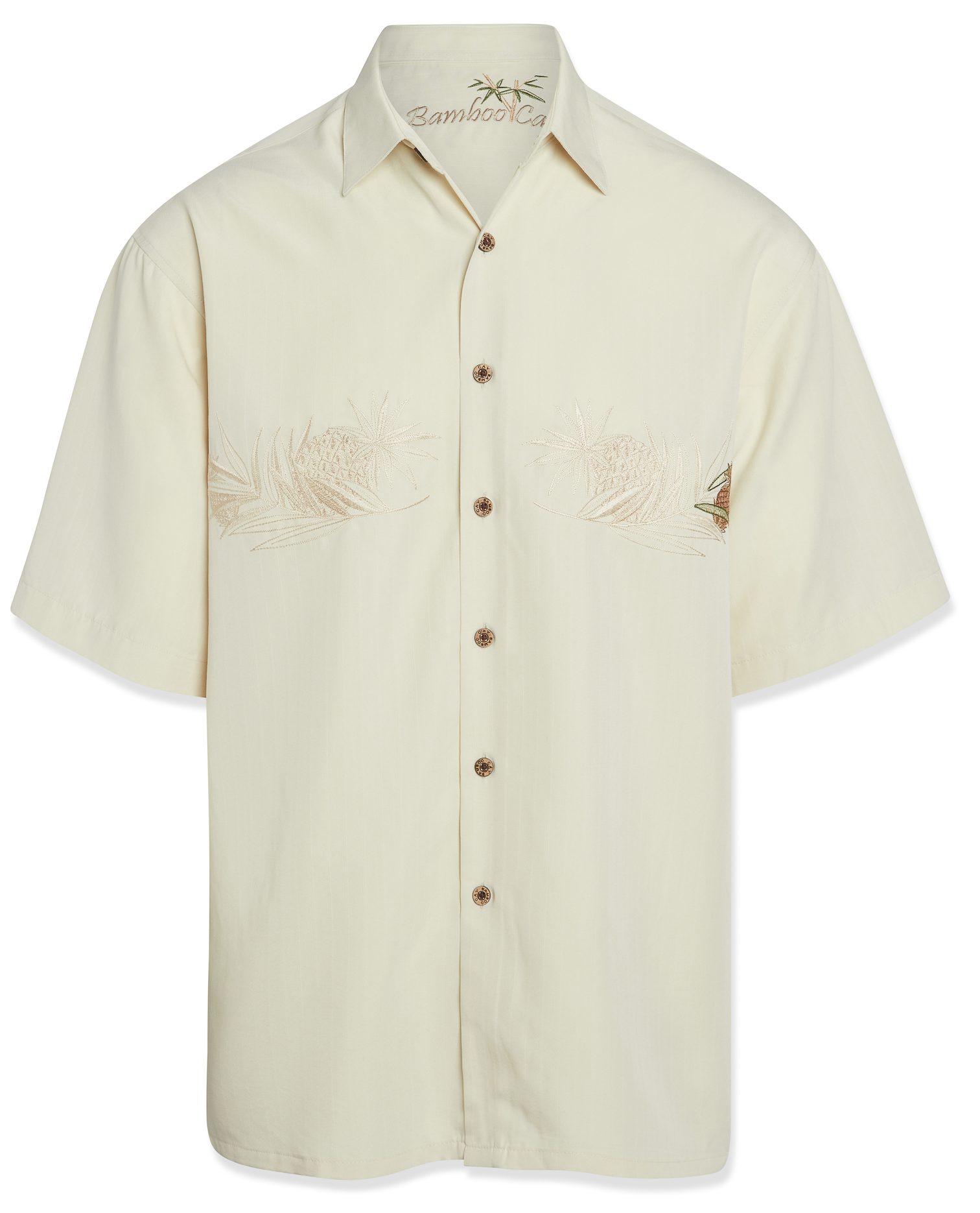 On island time in this button-down from Bamboo Cay, featuring embroidered tonal leaves at wearer’s chest, button-front closure with authentic coconut buttons and a pointed collar. Modal blended Bamboo Cay fabric gives you an island inspired vacation feeling while worn.