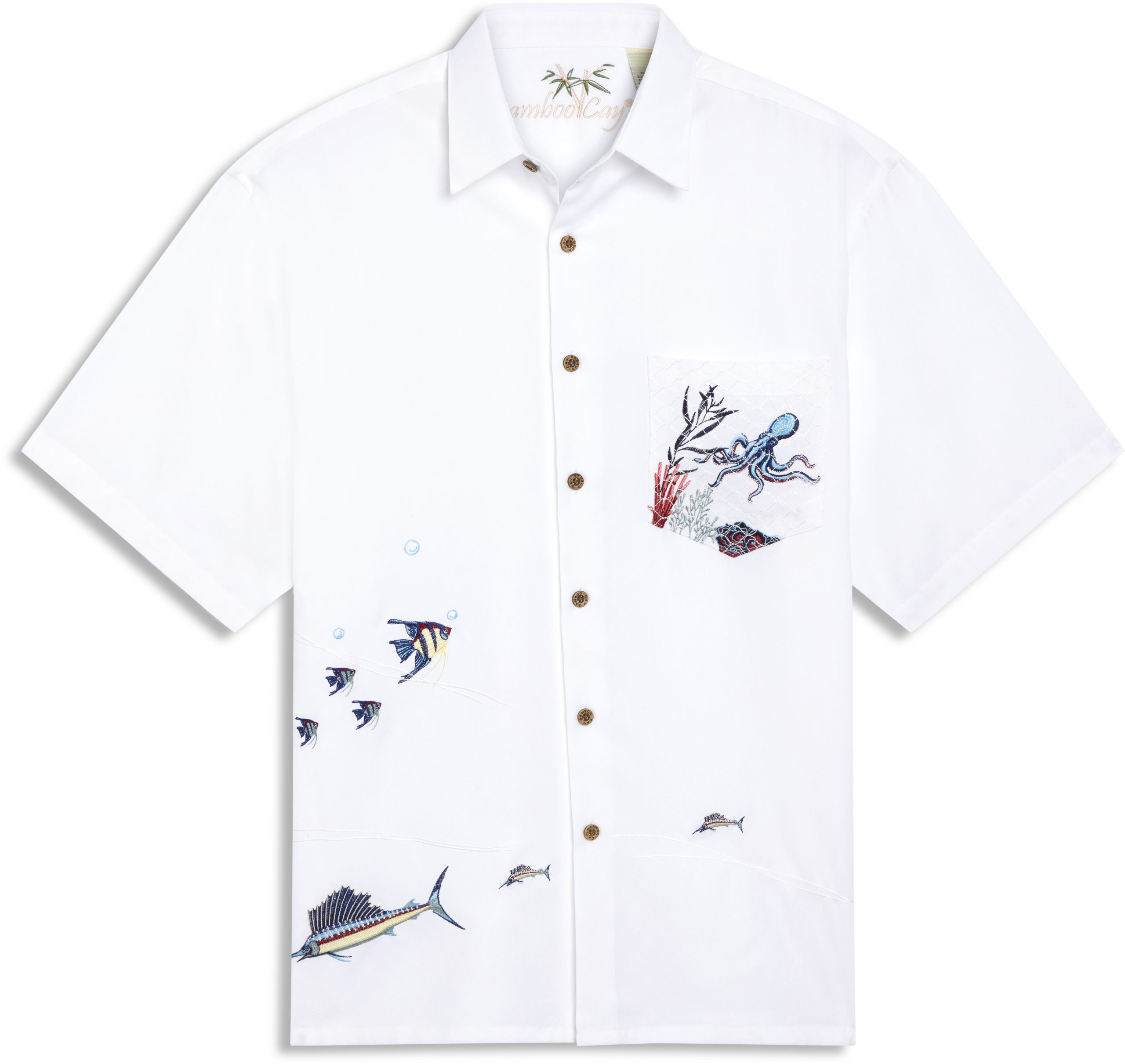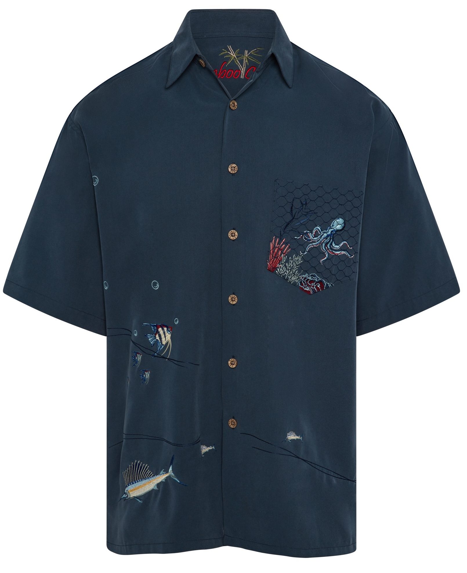 The CAPTURED OCTOPUS is the first ever Bamboo Cay product that features an Octopus. In this original copyrighted artwork, there is a Bamboo Cay octopus embroidered on the pocket, surrounded by his natural habitat and over the pocket there is an embroidery of an artificial net to give the impression that it is captured. Below the captured octopus we have various other Bamboo Cay fishes. Nothing at the backside. Embossed on our signature lightweight, machine washable, silky modal fabric; featuring: laser engraved authentic coconut buttons, side vents, and point collar. Bamboo Cay will get you noticed without drawing any attention to yourself. Compliments are expected.