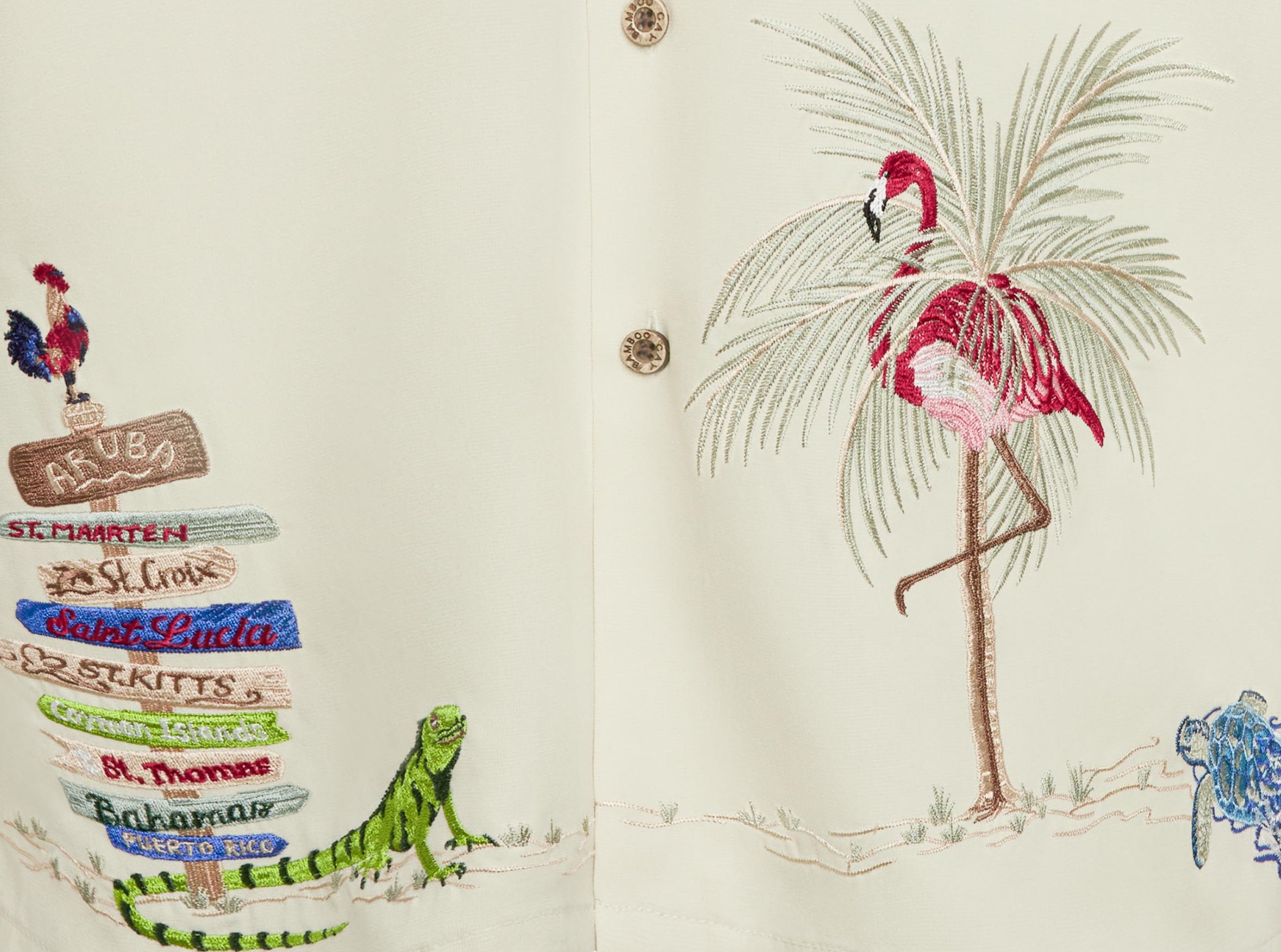 One of our best sellers and a customer-favorite weekend edition, the Bamboo Cay Caribbean Treasures embroidered shirt showcases different island destinations beneath the shade of a palm tree and the watchful presence of a vibrant, colorful flamingo. Finished with a pointed collar, full-length front button closure, and crafted from a soft, textured imported modal fabric, this shirt delivers standout island style with effortless comfort. This Bamboo Cay shirt gets you noticed without trying too hard.