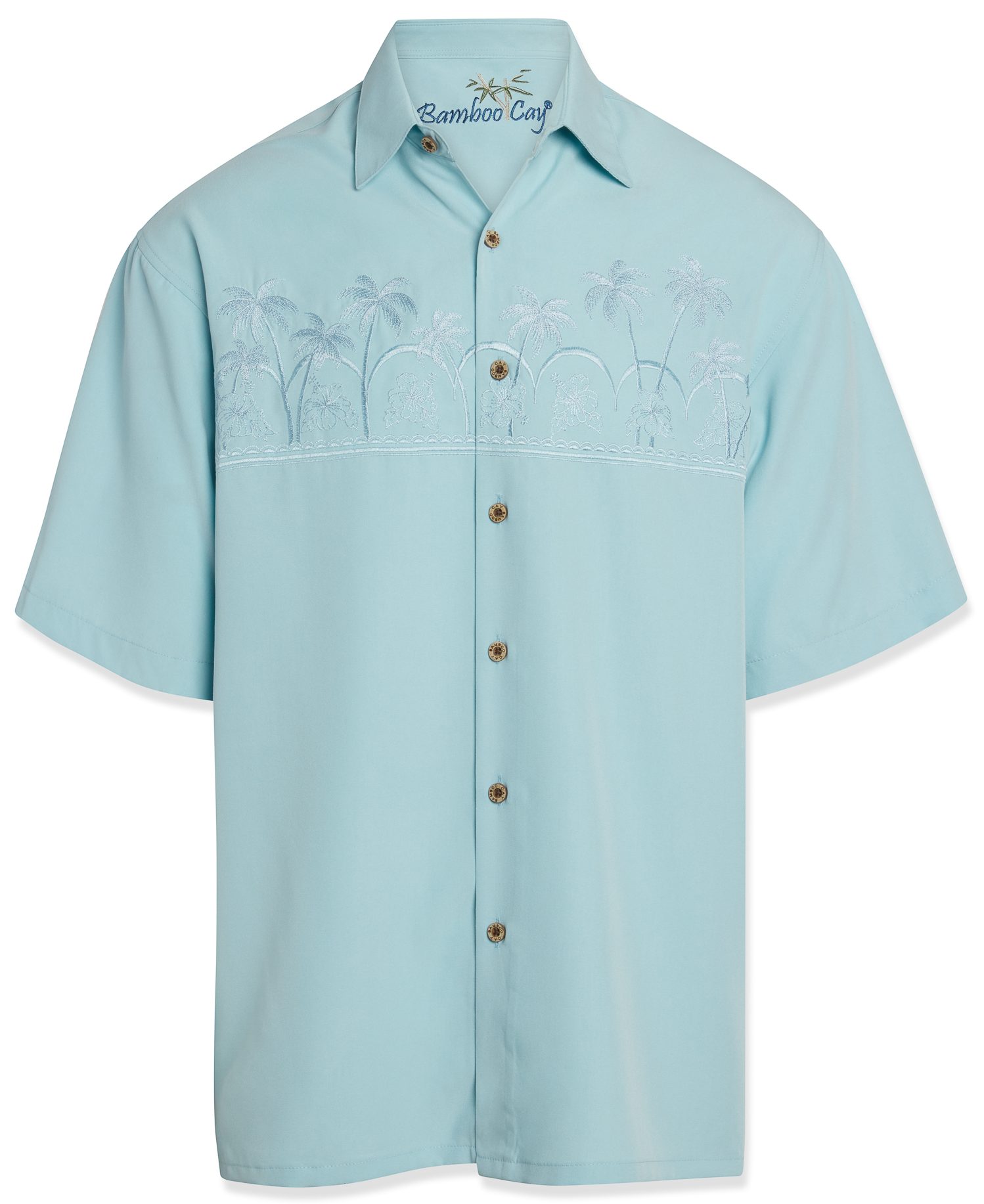 Bamboo Cay signature palm trees embroidered across the wearer’s chest in a subtle look. Fully matched across the chest, nothing at backside. Short sleeve camp shirt finished with a pointed collar, full-length front button closure and a split hem, embossed on our island soft modal blend imported fabric that is also machine washable. Bamboo Cay will get you noticed without drawing attention to yourself. Come along with us and enjoy relaxing Bamboo Cay fine resort wear for men, designed for comfortable living in your paradise. Our goal is to bring the island lifestyle into your daily life.