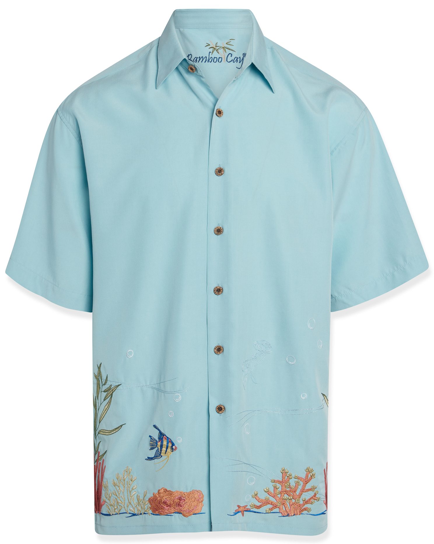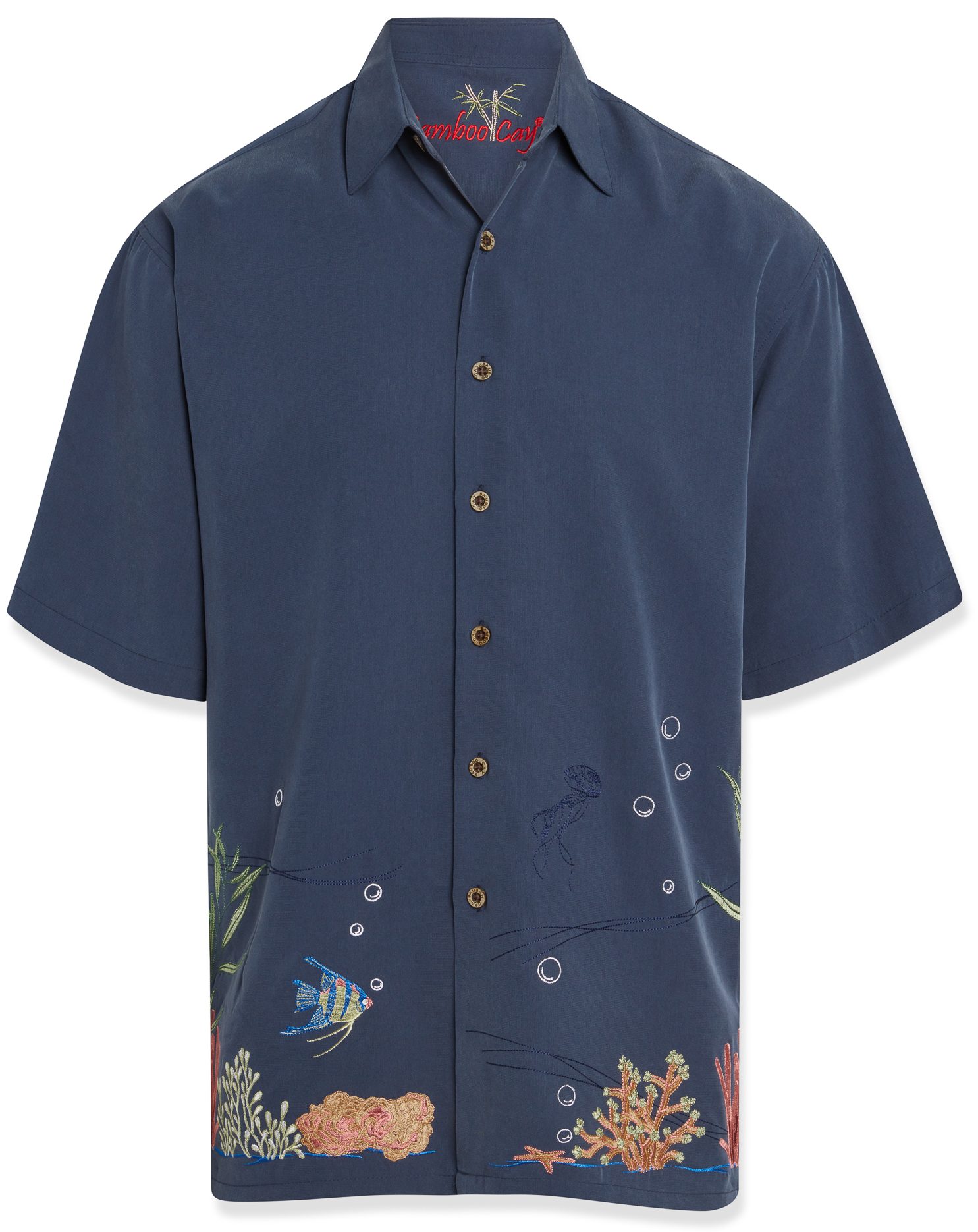 Come along with us and explore Bamboo Cay’s deep sea aquatic life. Elegant and tasteful original artwork of life under the sea with corals and jellyfish motifs. Very casual and sharp looking, with deep navy color or aqua color options available. No pocket and nothing at the wearer’s backside. Featuring a point collar and comfortable side vents. Signature logo embroidered at bottom of placket. Bamboo Cay will get you noticed without drawing attention to yourself.