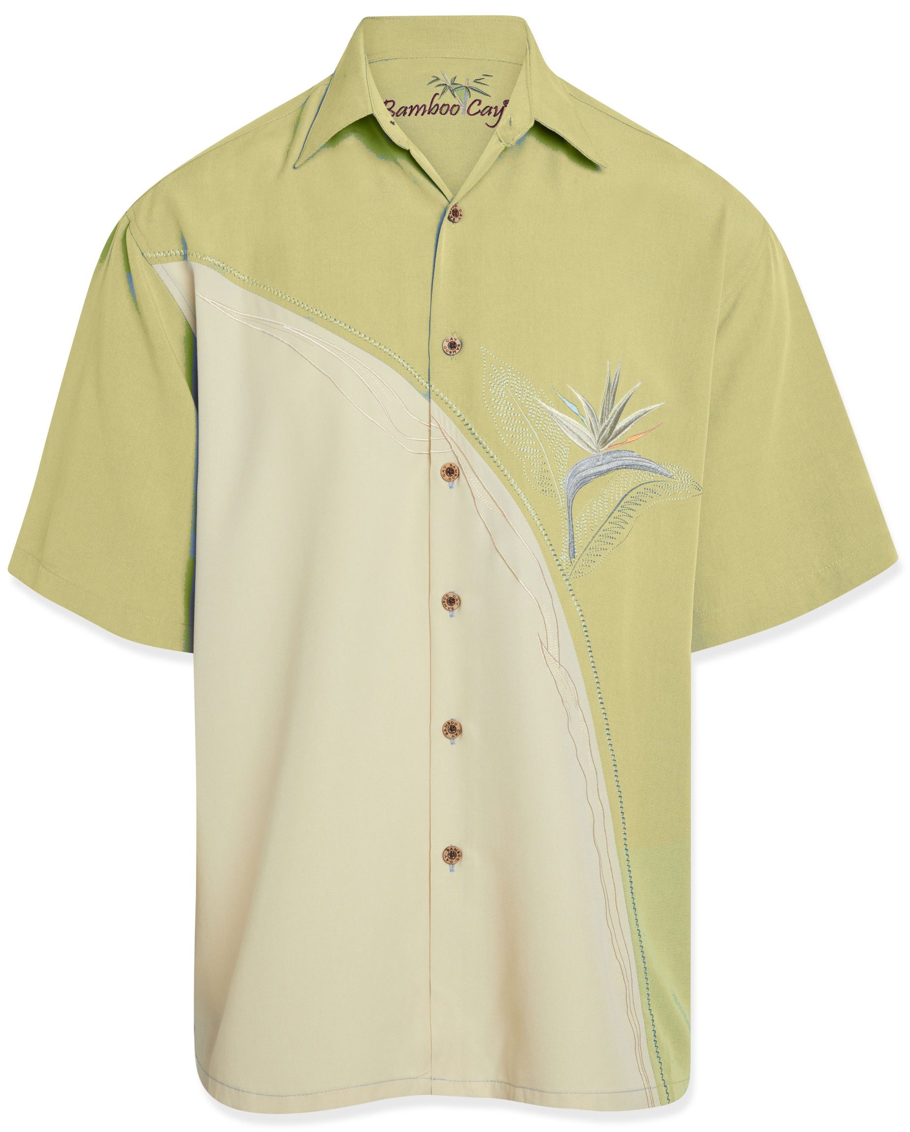 Adding an element of design, this diagonal panel features a brightly colored embroidered Bird of Paradise made up of 66,000 stitches. Add some striking tropical style to your look with this comfortable camp shirt featuring 66,000 stitches bird of paradise embroidery that is accented with a curved panel and decorative stitching. Bamboo Cay signature classic and a tasteful collector’s item.
