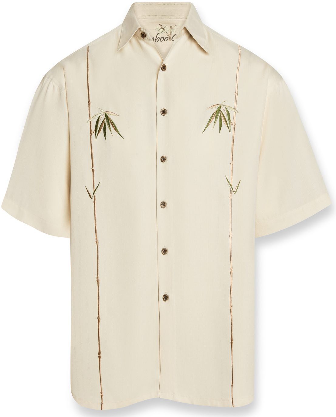 Short sleeve front embroidery of 2 vertical bamboo stems going down from top to bottom with a few bamboo leaves added to make this exquisite embroidered camp shirt a Bamboo Cay classic. Tasteful artwork done in a subtle manner, composed of thousands of stitches very much suitable for weddings, dinners, etc. Bamboo Cay will get you noticed without drawing attention to yourself.