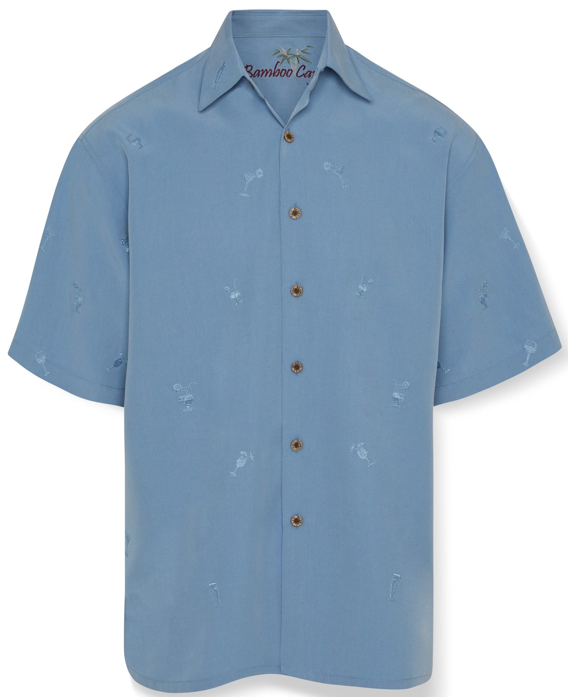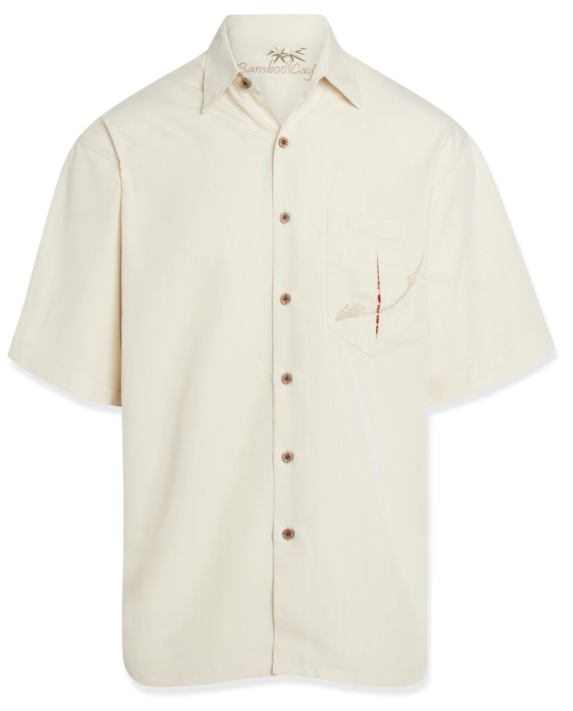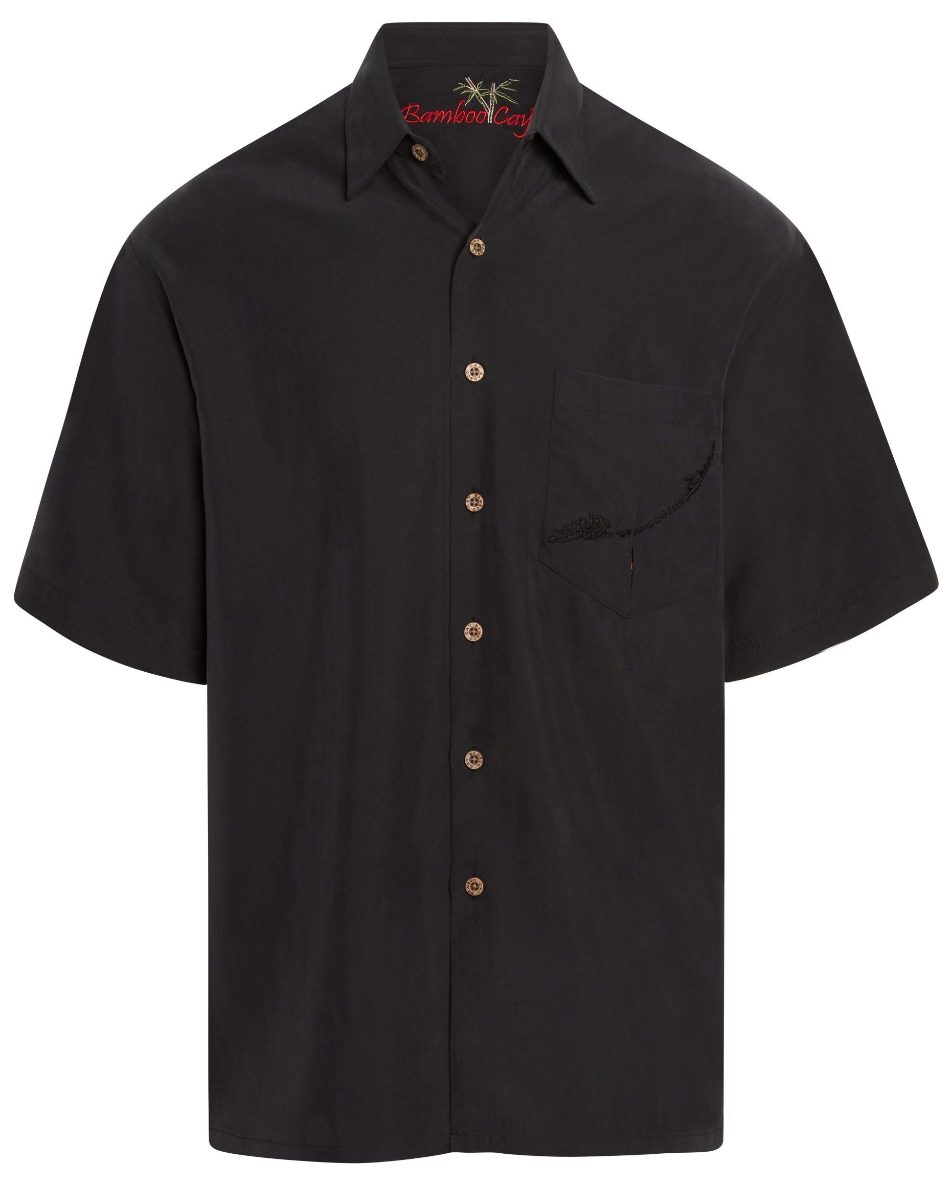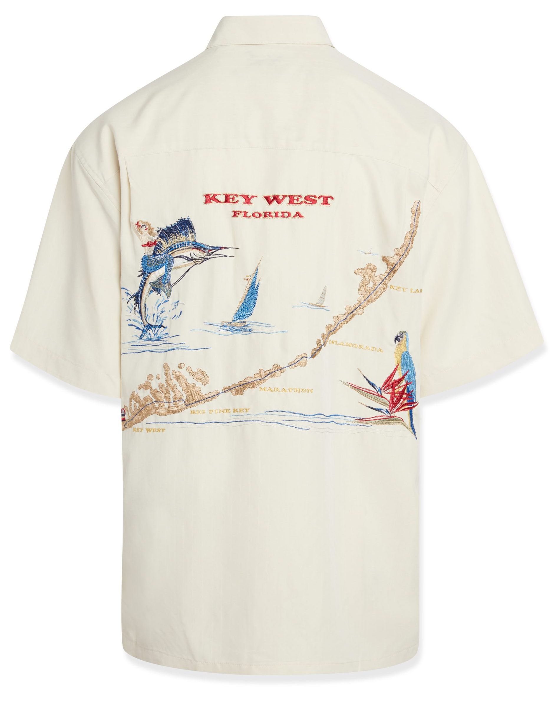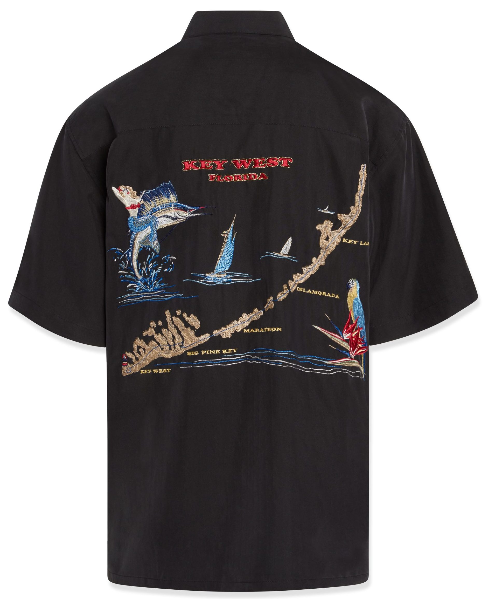 Short sleeve back embroidered button-down shirt featuring the map of Key West and all of it’s major cities embroidered with a colorful sailfish and mermaid on the left-side. On the front is a slit pocket with the letters “Key West” vertically embroidered creating a peekaboo affect. Finished with a pointed collar, full-length front coconut button closure and a split hem. Embossed on a soft textured imported modal fabric, this Bamboo Cay shirt will get you noticed without drawing attention to yourself.