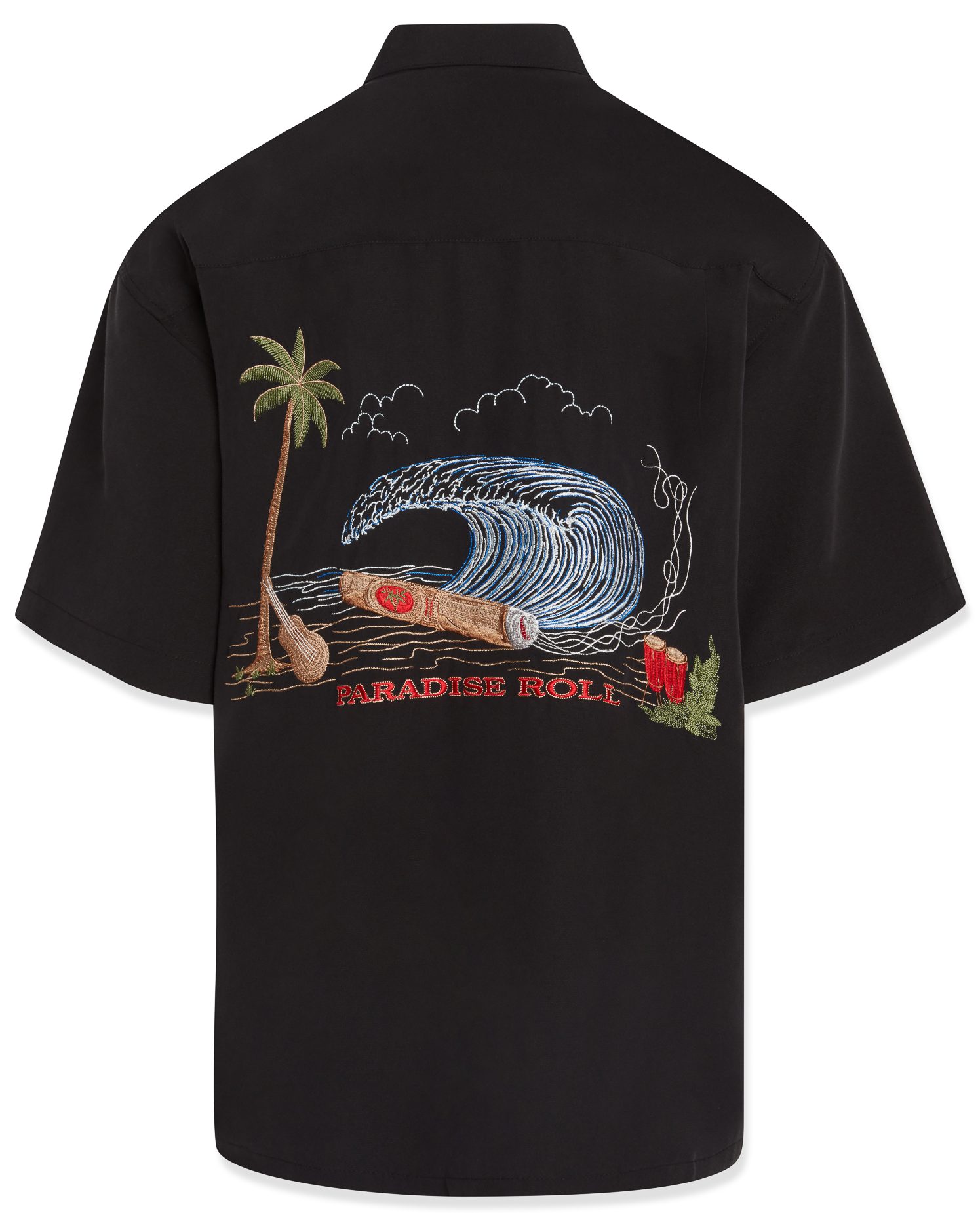 Well-crafted back embroidery design of a Bamboo Cay cigar rolling into a wave and splashing onto paradise island. Subtle musical motifs added to this paradise scene. Features a front pocket with the impression of a cigar inside of it. Over 140,000 stitches embossed on our signature modal blend fabric.