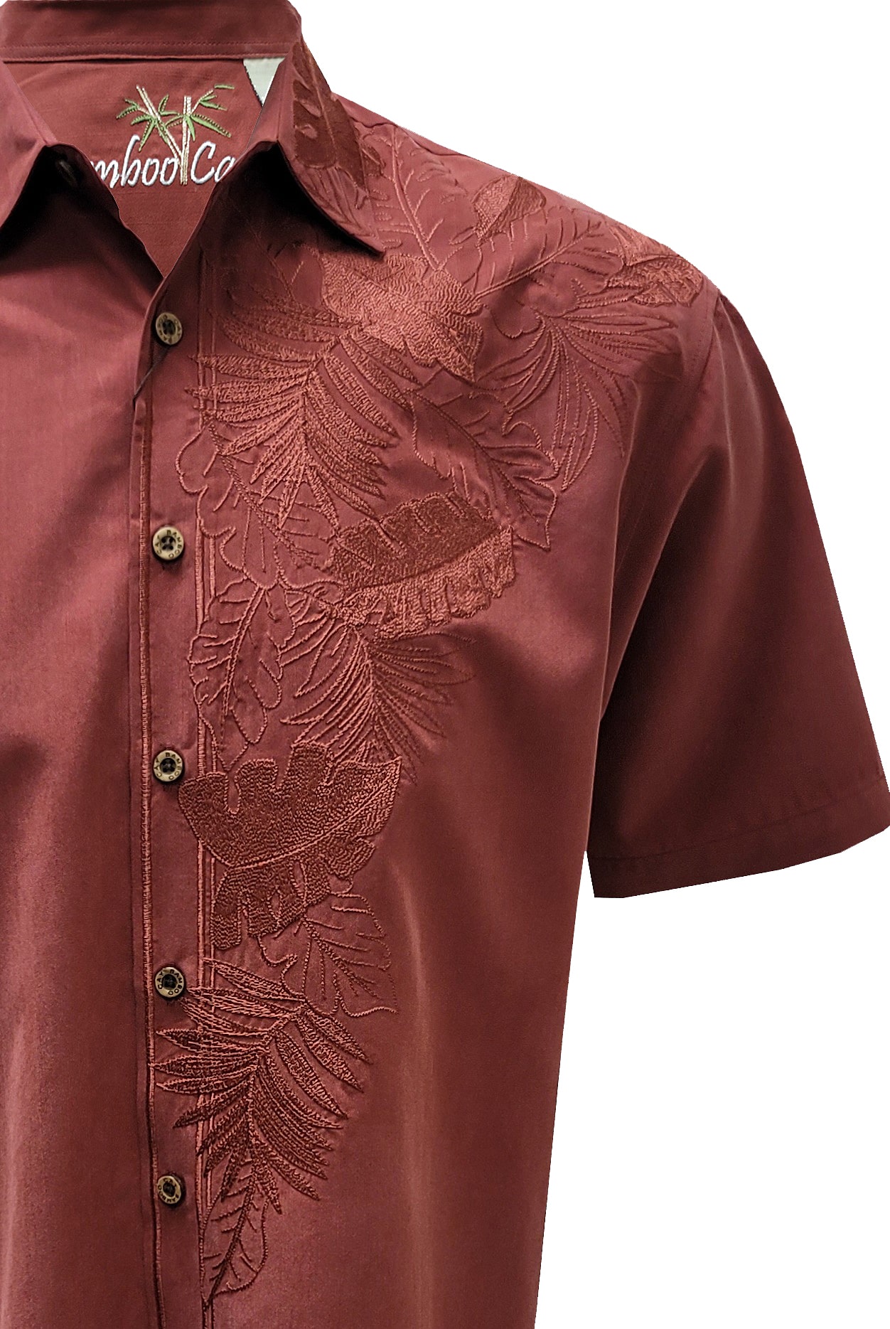 This short sleeve front embroidered shirt features tonal shoulder tropical motifs starting at wearer’s left shoulder top towards the bottom of the placket. Very nice and subtle, non-loud shirt for any occasion. Finished on our signature modal blend fabric with authentic coconut buttons and a point collar. Bamboo Cay will get you noticed without drawing attention to yourself.